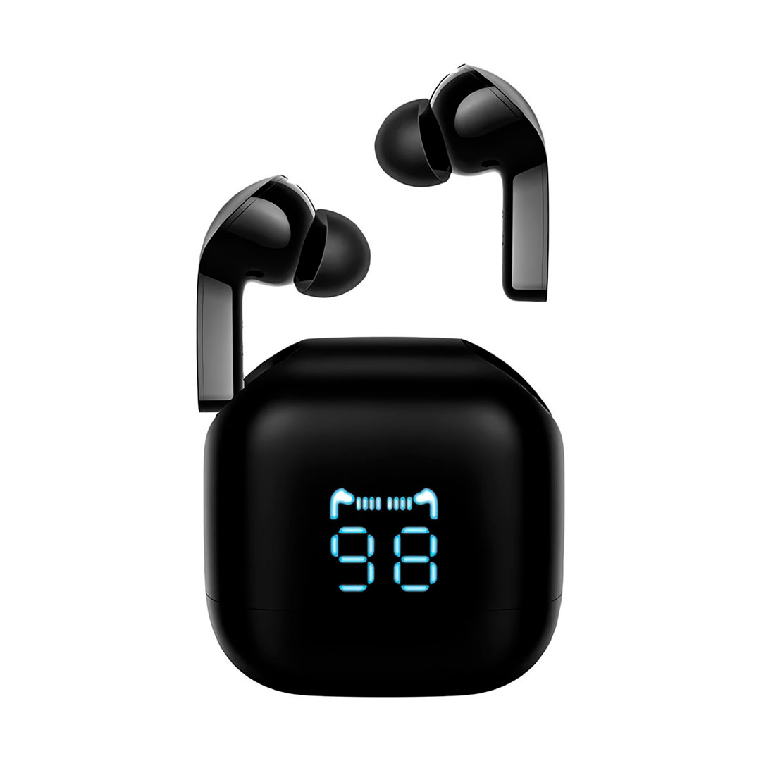 uriculares compactos con cancelación de ruido ENC, manos libres y controles táctiles. Estuche con display digital y batería de gran capacidad (2000 mAh), incluso funciona como powerbank. Hasta 6,5 h de uso por carga y más de 100 h con el estuche. Puerto USB-C. Color: Negro.