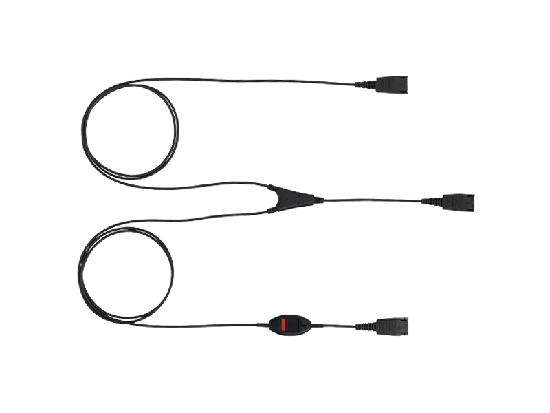 Cable Jabra Supervisor Cord. Este cable permite conectar dos auriculares de desconexión rápida (QD) Jabra a un cable inferior con fines de supervisión. Un extremo del cable puede utilizar el interruptor para estar en silencio o participar en la conversación. (8800-02-019)