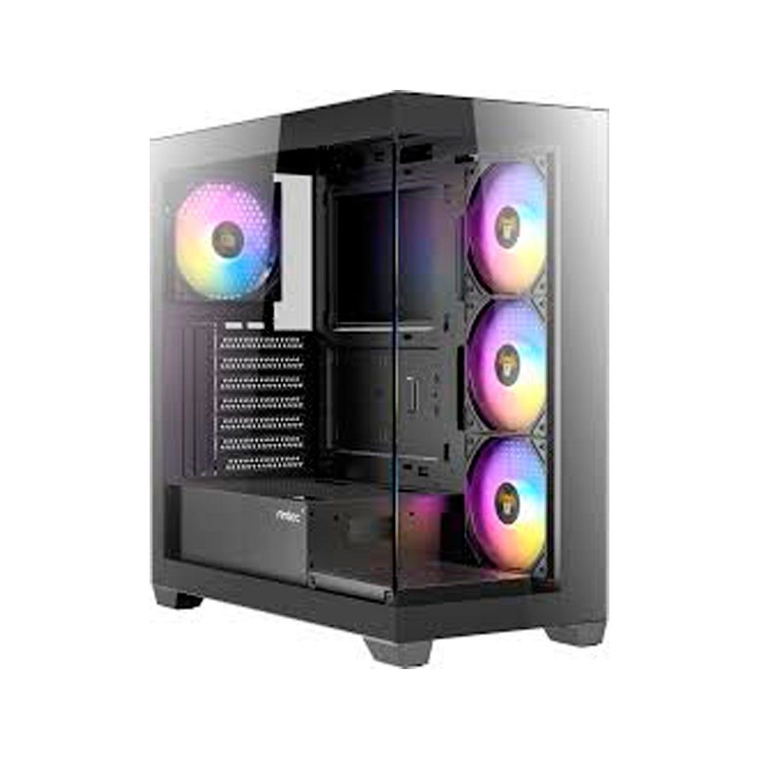 Gabinete ANTEC CX300 ARGB.Chasis Mid Tower de acero y vidrio templado de 4?mm, compatible con placas ATX, Micro-ATX e ITX. Soporta hasta 7 ranuras de expansión, radiadores de hasta 360?mm (superior) y GPUs de hasta 420?mm. Incluye 4 ventiladores ARGB (3 laterales + 1 trasero) y filtros de polvo en la parte superior e inferior. Altura máxima del cooler CPU: 170?mm.