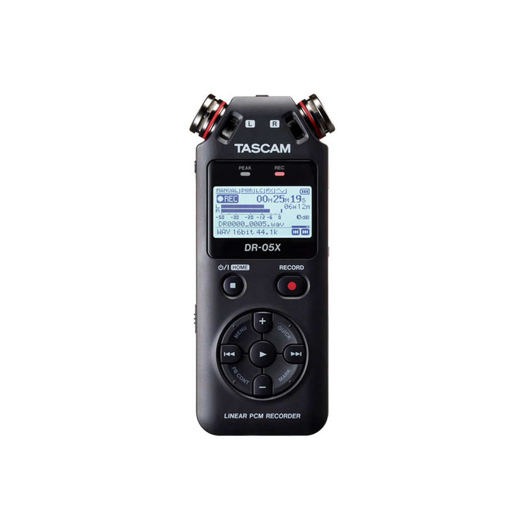 Tascam DR-05X Grabador de audio portátil de 2 entradas / 2 pistas con micrófono estéreo incorporado. Micrófono: par estéreo de condensador omnidireccional incorporado, configuración A / B. Altavoz incorporado 0.3 W mono. Monitor LCD monocromo (retroiluminado). Soporte de tarjeta de memoria: microSD (64 MB 2 GB); microSDHC (4 GB a 32 GB); microSDXC (48 hasta 128 GB). Formatos de archivos de audio: BWF, MP3, WAV. Para aplicaciones de grabación de voz, efectos de sonido y música en vivo, la Tascam DR-05X portátil portátil es capaz de capturar dos pistas de audio de alta resolución sin necesidad de micrófonos externos.