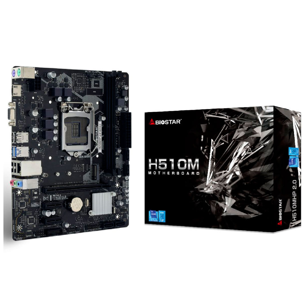 Motherboard BIOSTAR H510 Compatible con procesadores Intel Core™, Pentium y Celeron de 10ª y 11ª generación (Socket 1200). Chipset Intel H510. Memoria DDR4 de hasta 64 GB, soportando frecuencias de 1866 a 3200 MHz. Gráficos compatibles con DirectX 12 y HDCP. Audio Realtek ALC897, 7.1 canales. LAN Intel I219V Gigabit. Formato Micro ATX (18.5 x 22.6 cm). Almacenamiento con 4 conectores SATA III y 1 zócalo M.2 PCIe 3.0 x4 (32 Gb/s) y SATA III (6 Gb/s). No soporta RAID. H510MHP 2.0 VER. 6.0