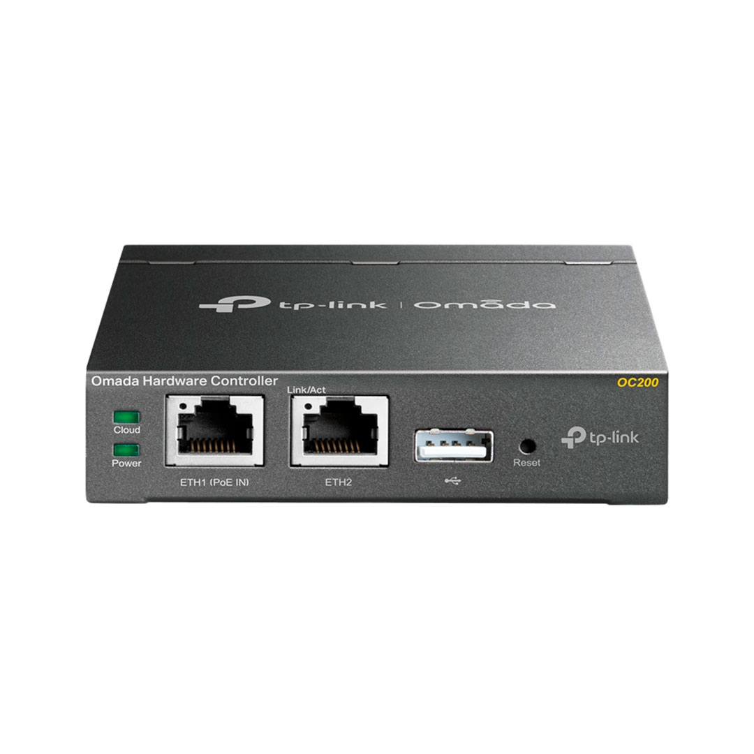 TP-Link Omada OC200 controlador cloud para plataforma SDN Omada con gestión centralizada de hasta 100 AP, 20 switches JetStream y 10 routers; administración local o remota mediante nube híbrida; monitoreo de red, topología, estadísticas y alertas; simulador de mapa de calor Wi-Fi, gestión multisitio y actualizaciones remotas; puertos: Ethernet 10/100 Mbps x2, USB 2.0 x1, Micro-USB x1; alimentación PoE 802.3af/at o 5 V Micro-USB; dimensiones 100 × 98 × 25 mm; color negro