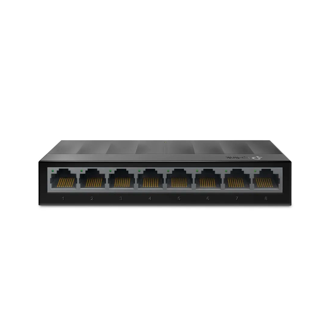 Switch TP-Link LS1008G de escritorio con 8 puertos Gigabit RJ45 con auto negociación y soporte Auto-MDI/MDIX. Incluye tecnología Green Ethernet para eficiencia energética, control de flujo IEEE 802.3X, carcasa plástica apta para pared o sobremesa, sin ventilador y sin necesidad de configuración.
